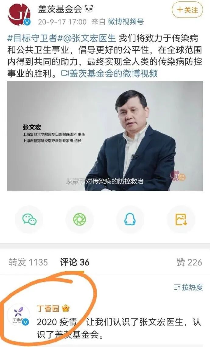 而早在2020年9月17日,美国“盖茨基金会”就曾发帖称与张文宏医生合作。而丁香园官微转发评论说“2020疫情,让我们认识了张文宏医生,认识了盖茨基金会。
