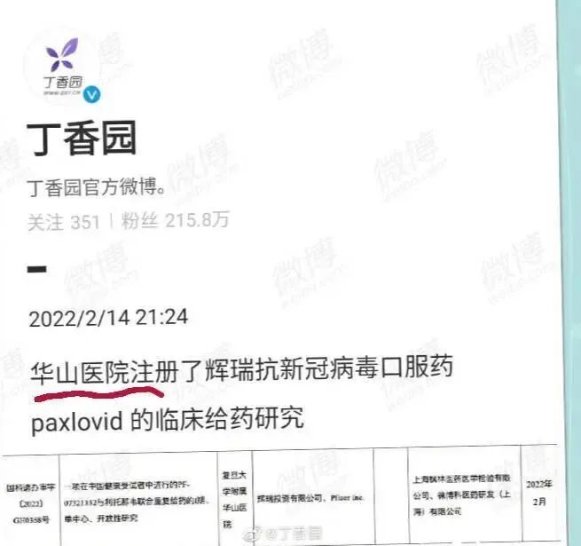 而早在2022年2月14日,丁香园官方微博就曾发帖称“华山医院注册了辉瑞抗新冠病毒口服药Paxlovid的临床给药研究。”