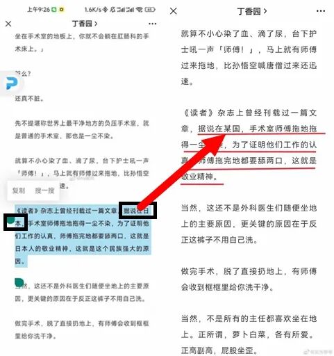 7月25日,丁香发文《主任爱坐在地上的原因找到了》,声称《读者》杂志上曾经刊载过一篇文章,据说在日本,手术室师傅拖地拖得一尘不染,为了证明他们工作的认真,师傅拖完地都要舔两口,这就是敬业精神