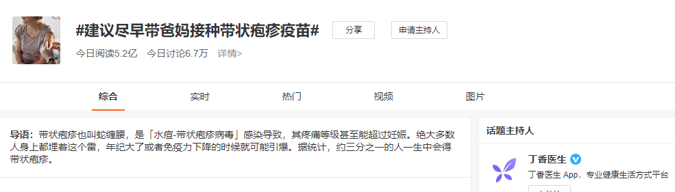 6月19日,丁香园就炒作起了“建议尽早带爸妈接种带状泡疹疫苗”。