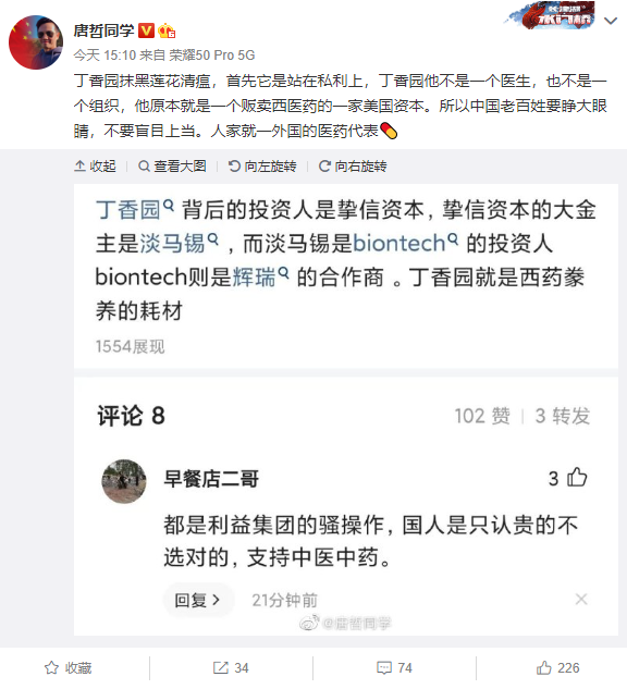 说起丁香园对我国抗疫的攻击、造谣,对连花清瘟的抹黑、围剿,韬哥想起一个攻击我国方舱医院、污蔑连花清瘟的一个上海私人医院的女医生,她个人微博个“朱筱吟医生”认证是“张强医生集团静脉病专科主诊医生,医生部总监”。