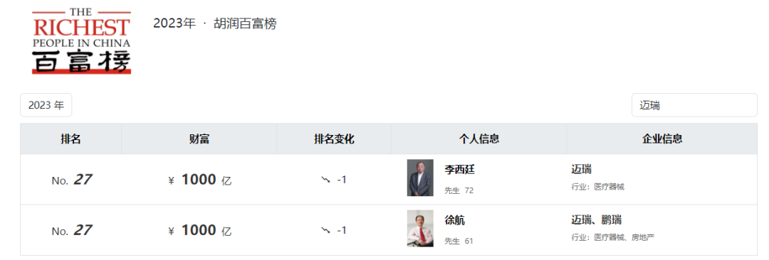 除了钟睒睒,此次《2023年胡润百富榜》,在前100名当中,迈瑞医疗的徐航以及李西廷均以1000亿元的财富排名第27位。