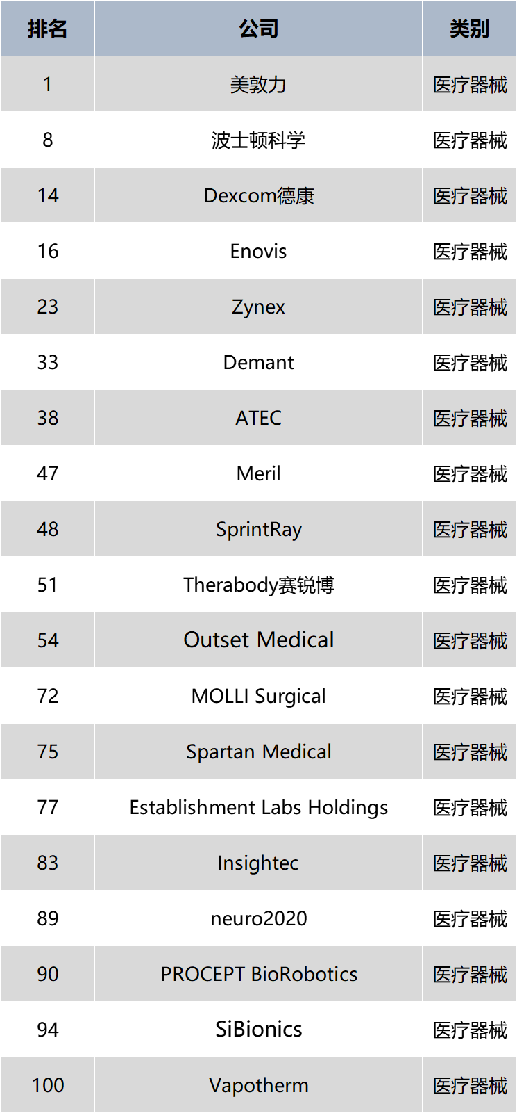 器械之家对今年前100家医疗科技公司的名单进行了整理,筛选出19家医疗器械行业的公司,并对前十名进行详细介绍。(完整名单见文末)