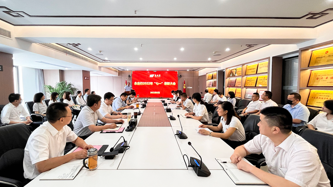 2022年6月28日,永业行党委举办“七一”表彰大会,对先进党支部和优秀共产党员进行表彰。永业行党委书记、董事长潘世炳出席会议并讲话。公司党委成员、高管、各党支部书记、党员代表,相关部门负责人共计50余人通过线上或线下方式参加会议。党委委员、常务副总裁吴学锋主持会议。 大会在雄壮的国歌声中拉开帷幕。永业行党委委员、副总裁雷小军宣读了《关于表彰2022年先进党支部的决定》《关于表彰2022年优秀共产党员的决定》,党委书记潘世炳,党委委员吴学锋、文云波分别为自然资源党支部等3个先进党支部、田罗等15名优秀共产党员颁发奖牌和证书。