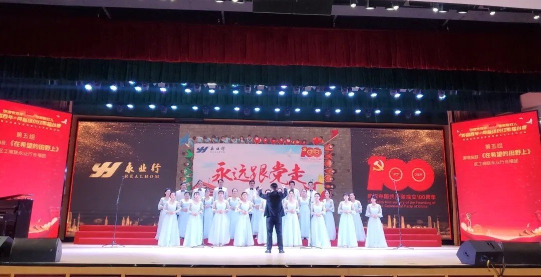 “传唱百年”贺华诞 应武昌区工商联会员企业党委邀请,6月7日,永业行合唱团参加武昌区 “传唱百年” 两新组织红歌擂台赛,深情演唱《在希望的田野上》。伴随着激昂的旋律,24名合唱团团员以饱满的激情、悠扬的歌声,唱响了永业行“永远跟党走”的红色信仰,为中国共产党百年华诞献礼。 当天,武昌区共18支代表队参赛,现场氛围活泼而热烈。武昌区委常委、组织部部长胡太荣,武昌区委组织部副部长、两新工委书记钱勇,两新工委专(兼)职副书记及区各街道党建办副主任等领导出席本次活动。 学党史 开新局